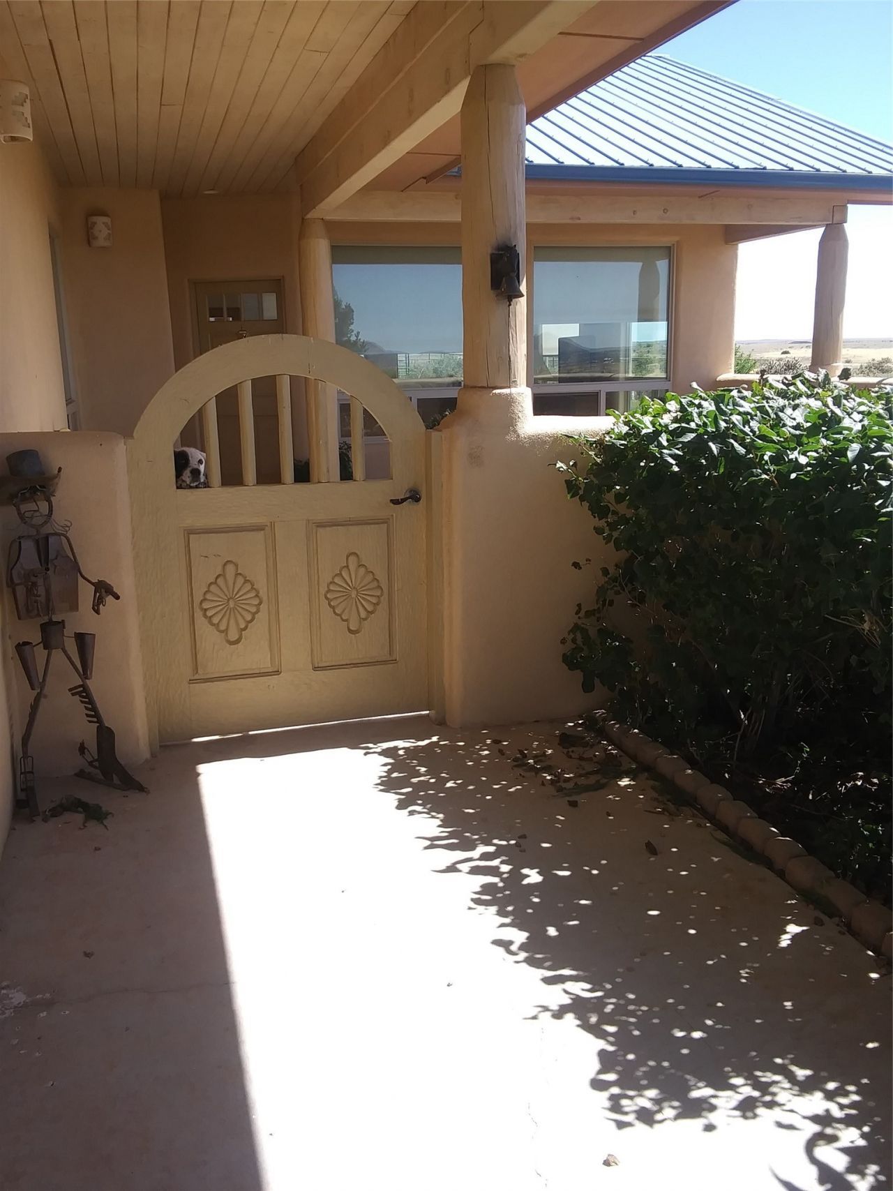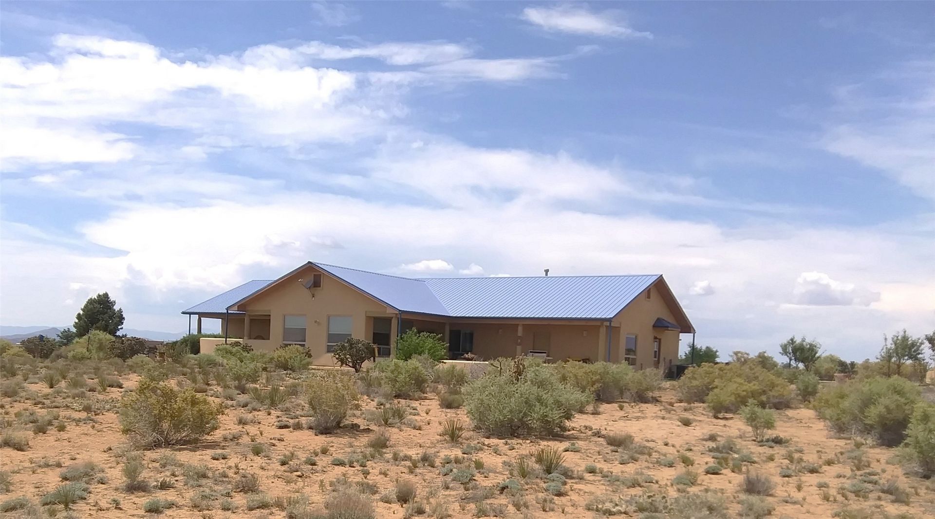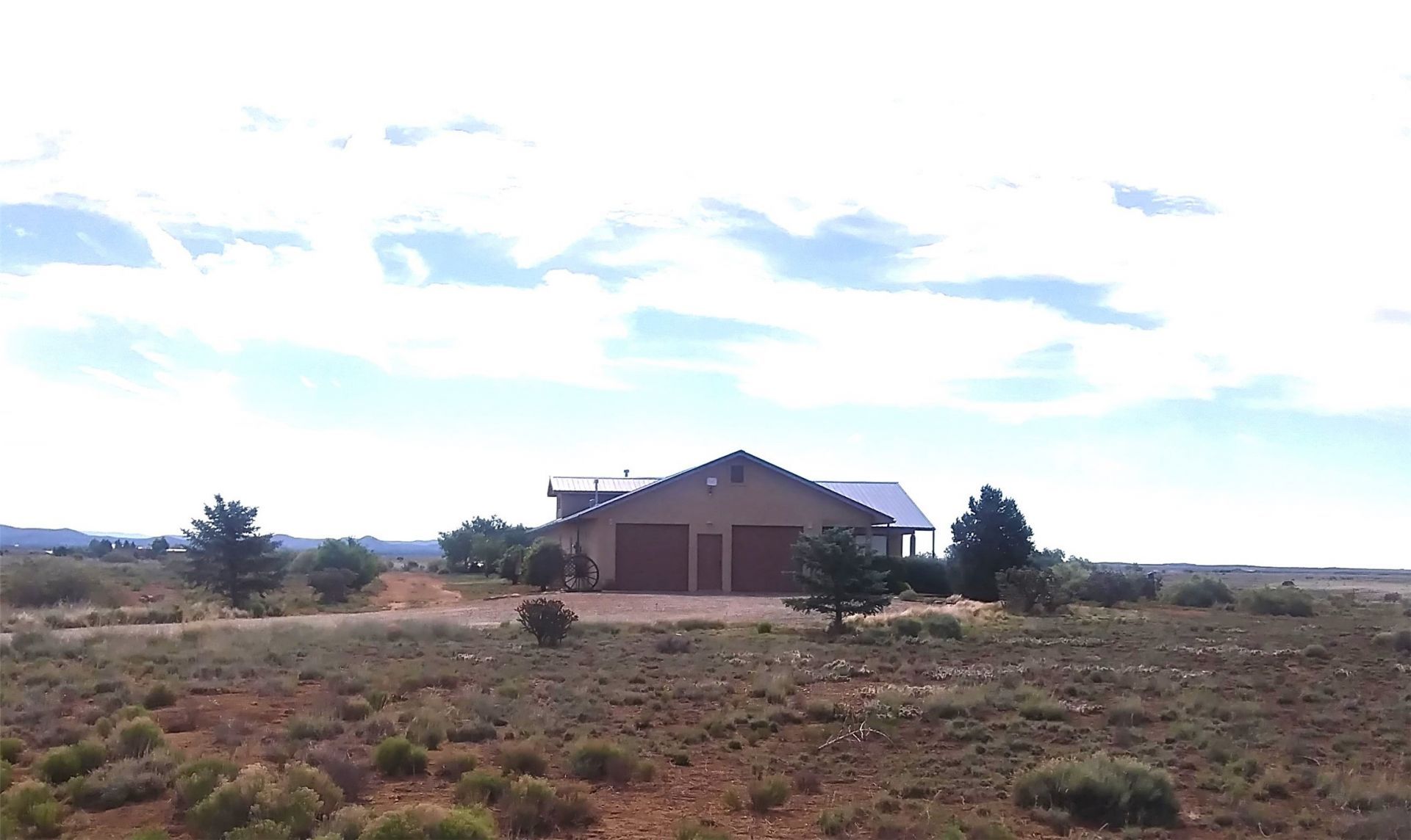Set on over 15.8 acres in Rancho San Marcos, this Northern New Mexican-style home offers wide-open space, big views, and true equestrian functionality approximately 30 minutes from the Santa Fe Plaza. The 3-bedroom, 2-bath layout includes a flexible bonus room ideal for an office, studio, or additional living space, with an open-concept kitchen, dining, and living area designed to take in the surrounding high desert landscape. Large windows frame mountain and sunset views, while the covered patio provides a quiet place to enjoy the natural setting and expansive skies. The primary suite features a walk-in closet and a spacious bath with a soaking tub. For horse enthusiasts, the property is well-equipped with a 3-stall steel barn, tack and hay storage, workshop space, and a large corral. Direct access to community riding trails, along with a 50-acre horse park, round pen, and arena, adds to the appeal. Additional features include a 2-car garage with overhead storage, private well, septic, and a durable metal roof. Located within a gated community known for its privacy and scenic surroundings. Property is being offered in as-is condition and presents an opportunity for a buyer to update and personalize while capturing the value of the land, setting, and equestrian infrastructure. Property is sold in As-Is condition.