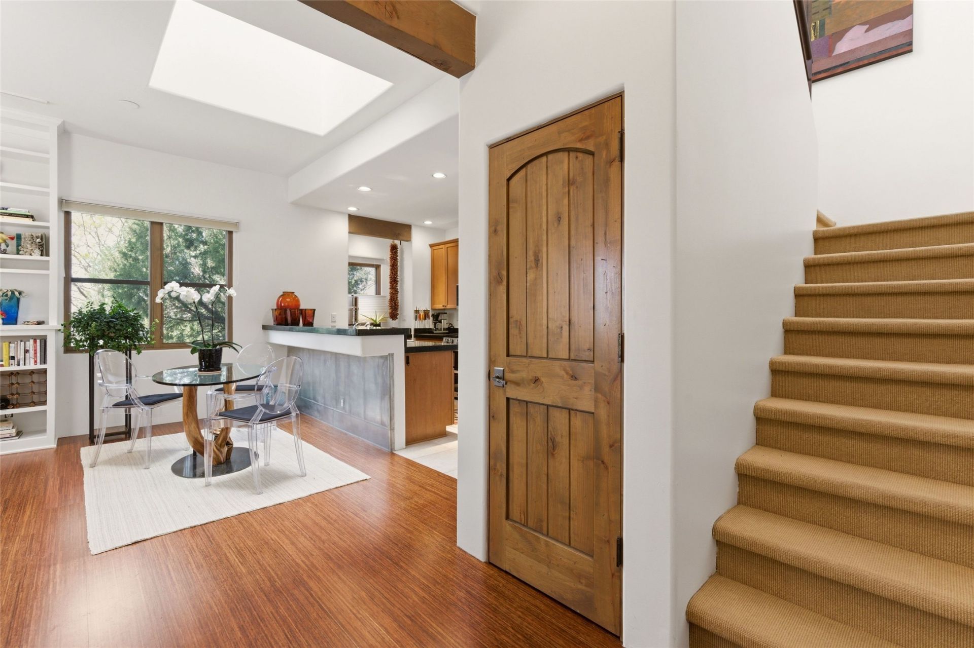 Located in the desirable Las Estrellas neighborhood on Santa Fe's northside, this exceptional home offers panoramic mountain and city views from a premium corner lot at the end of a quiet cul-de-sac. This light-filled, lock-and-go home features an open, airy floor plan with seamless flow between living, dining, and kitchen areas -- ideal for everyday living and entertaining. This nicely landscaped, shady backyard is fully fenced for pets and perfect for outdoor gatherings. Originally a model home, it includes numerous upgrades such as custom-built-in bookshelves and two upper decks, one of which is a private rooftop deck off the primary suite with a walk-in closet and stunning Sangre de Cristo views. Recent improvements include a Mitsubishi ductless cooling and supplemental heating system, new stainless steel appliances, updated LED lighting and new window shades throughout the home. Residents enjoy a community park, paved paths and access to Santa Fe's extensive trail network. Peaceful yet convenient, this northside location is just minutes from the Plaza and DeVargas Mall with easy access to Los Alamos and Albuquerque, offering an exceptional blend of views, privacy and modern comfort.