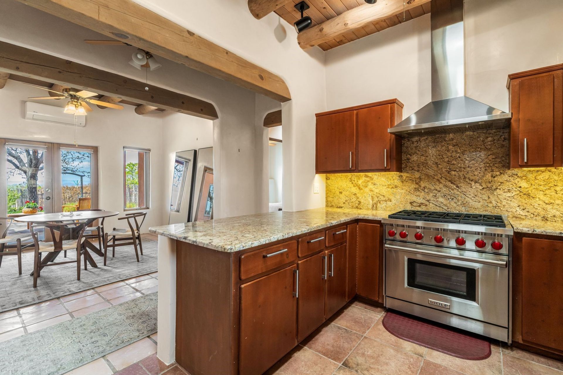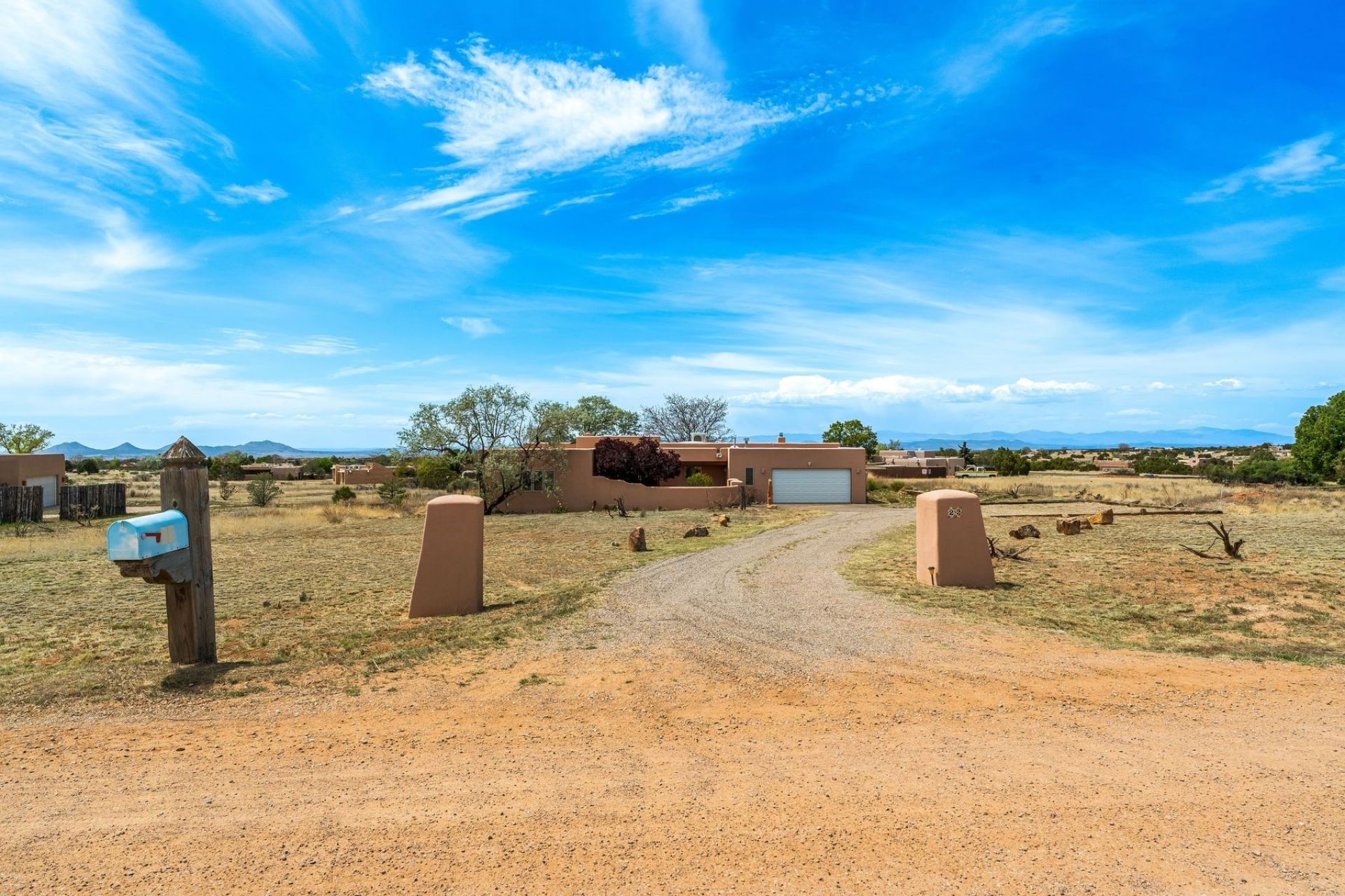 Beautiful large home in highly desirable Eldorado. Well-appointed large 4 bedroom, 3 full bathroom residence ideally located near the highly regarded K-8 Eldorado Community School, library, community center, senior center, community pool, supermarket and local shops. There is convenient access to Santa Fe. The home offers a thoughtfully designed floor plan that flows with ease, creating a comfortable and versatile setting for both everyday living and creative pursuits. The thoughtfully designed floor plan flows with ease. The separate office can effortlessly be used as flex area, art studio, playroom, den or exercise room. Diamond plaster walls add a sense of craftsmanship and character, while the kitchen is beautifully equipped with a six burner Wolf stove and Bosch refrigerator. Whether preparing a quiet meal or hosting a lively gathering, the space is designed to feel functional, versatile and inviting. Mini-split systems provide efficient zoned cooling and heating, providing year-round comfort. Additionally, there is radiant heat throughout the house and Kiva fireplaces in the living room and master bedroom. Outdoor spaces are gently oriented toward the surrounding landscape, with views of the Sandia, Ortiz and Jemez Mountains. There is easy access to local trails and Eldorado community amenities. Enjoy beautiful sunrises and sunsets all year! The setting provides a sense of openness and connection to the natural environment, complementing the home's inviting atmosphere. Welcome to your new home!