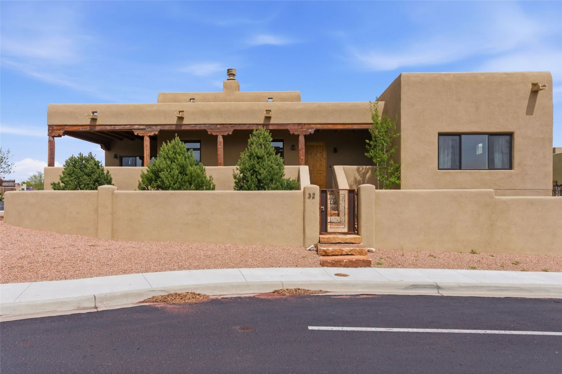 Sophistication meets classic Santa Fe style at 32 Calle Lemita, a beautifully designed home in the sought-after Aldea de Santa Fe community. This 3-bedroom, 3-bath residence sits on a 0.16-acre lot, offering abundant natural light and partial sunset views. The open-concept layout features soaring ceilings, upscale finishes, and seamless flow between the living, dining, and kitchen areas?ideal for everyday living and entertaining. The living room showcases a stacked stone fireplace, traditional vigas, and plaster walls throughout the main living spaces. The chef's kitchen is equipped with premium cabinetry with soft-close drawers, quartz countertops, designer tile backsplash, stainless steel appliances, and an large pantry/storage room (other options are wine storage/tasting room/office space). The primary suite offers a spa-like bath, an exceptionally customized walk-in closet, a separate shower, and a jacuzzi tub. Two additional oversized bedrooms provide flexibility for guests, office space, or hobbies. A dedicated laundry room includes a sink and built-in cabinetry. The home also features whole-house radiant heating and cooling. Adjacent to the heated and cooled four-car garage is a versatile flex space, ideal for a home gym or studio. Outdoor living includes a private enclosed courtyard and elevated patio designed to capture Santa Fe's stunning sunsets. There is also a side yard with dog run and doggy door into the heated/cooled garage. Additional upgrades include LED recessed lighting, floor-to-ceiling tile in select bathrooms, carved stone sinks, and other custom touches. Located about 20 minutes from the Santa Fe Plaza, Aldea de Santa Fe offers walking trails, pickleball, tennis, basketball courts, and community spaces near dining, galleries, and cultural attractions. Whether you're looking for a full-time residence or a lock-and-leave getaway, this home offers a perfect combination of comfort, privacy, and connection to Santa Fe's vibrant lifestyle.