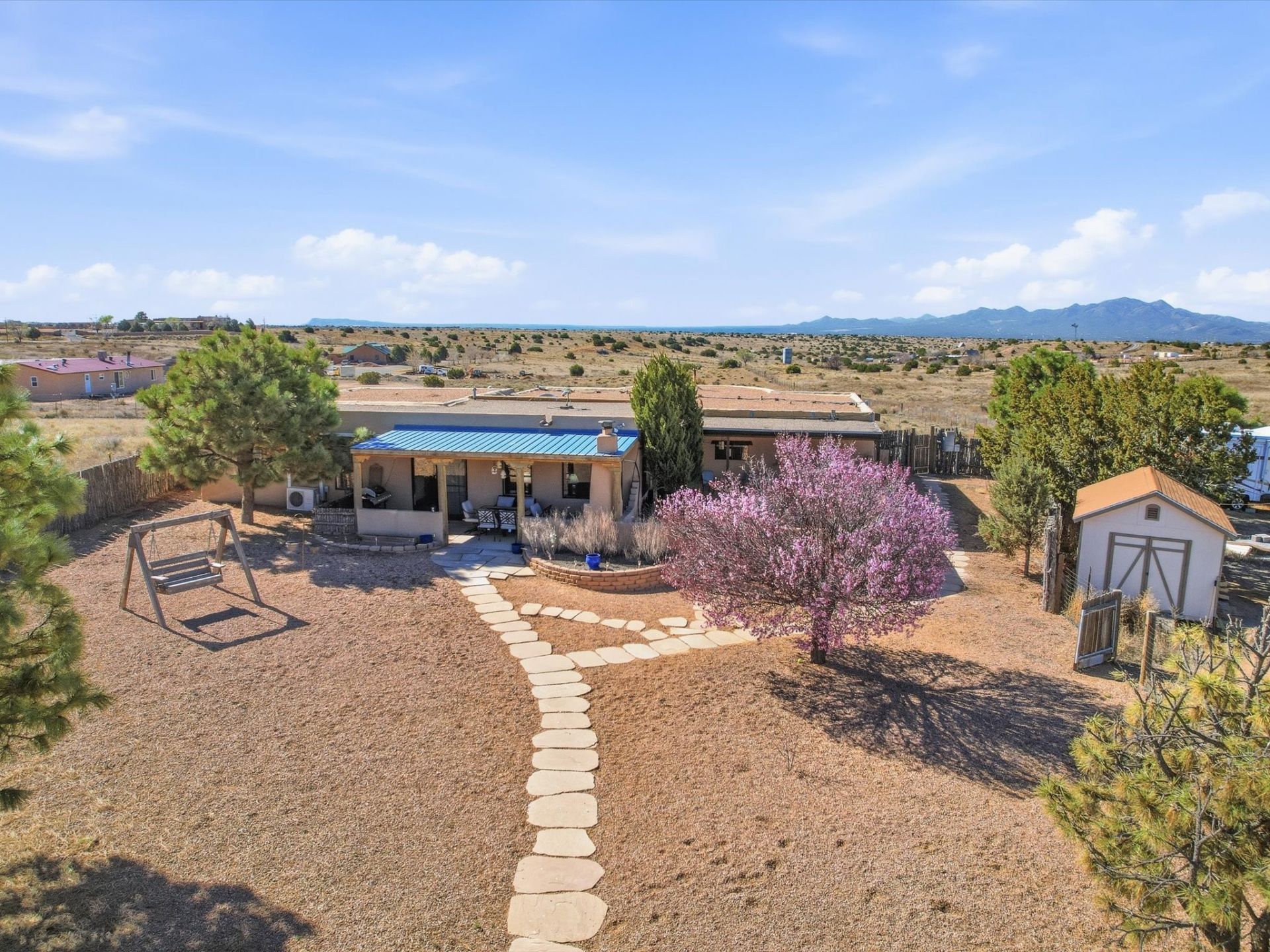 Set on 5.19 fully fenced acres just minutes outside Santa Fe, this Southwestern ranch retreat offers breathtaking sunrises, sunsets, and equally impressive dark night skies. The 4-bedroom, 2-bath single-level home features a light-filled open floor plan, tile and wood flooring, and expansive windows that showcase the surrounding mountain views. The circular Kiva-style living room, with twelve floor-to-ceiling windows, invites natural sunlight and the beauty of Santa Fe inside, while the spacious living area and two master suites provide comfort, privacy, and abundant closet space. Three additional rooms can serve as bedrooms, allowing for a total of five. Two outdoor patios?one with a tranquil water feature and one with a kiva fireplace?offer peaceful escapes year-round, where you can enjoy the many hummingbirds or watch a family of 16 ravens keep the barn animals company. The home seamlessly blends indoor and outdoor living, with large sliding windows in the main living areas letting in fresh mountain breezes. Equestrian enthusiasts will appreciate the three barns (one with a separate tack room), each with water and electricity, capable of hosting up to 12 horses, offering strong income potential from boarding. The nearly 4-acre fully fenced field provides a safe pasture for turnout and includes a 60' round pen for training. Recent updates include an attached insulated two-car garage with shop sink and ample storage, along with covered portals and patios designed for outdoor entertaining and relaxation. With no HOA restrictions, this property provides flexibility for horse lovers, hobbyists, and families seeking a peaceful retreat. Just minutes from Santa Fe's shopping, dining, and amenities, this well-maintained home is a bright, spacious ranch haven that captures the quintessential Santa Fe lifestyle?mountain views, abundant wildlife, and serene open spaces.