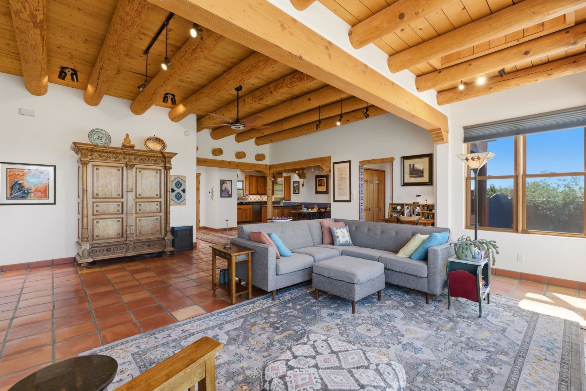 IT'S YOUR LUCKY DAY!! Sited on a greenbelt and at the end of a cul-de-sac, stunning mountain views greet you upon entering. Sierra West remodeled kitchen is a standout with cherry cabinetry, soapstone counters, 6-burner Wolf range, Sub-Zero refrigerator, JennAir microwave and Asko dishwasher. Six splits provide heat and air conditioning. Three bedrooms with and additional two bonus rooms that are connected to each other - offices or studio space - den or media room. One with a kiva fireplace and one with blackout shades. Pretty primary bedroom has viga ceilings, a kiva fireplace and motorized blinds. Primary bath has double sinks and separate shower. Good walk-in closet. Guest rooms have dramatic high planked ceilings. Walled courtyard in back. Oversized and finished 2-car garage. Closet off the guest hallway used to be a darkroom. Home has been pre-inspected - report available upon request. SELLERS REQUIRE A LEASEBACK UNTIL JUNE 30, 2026.