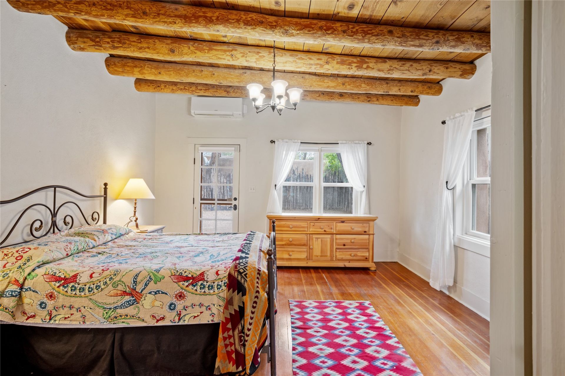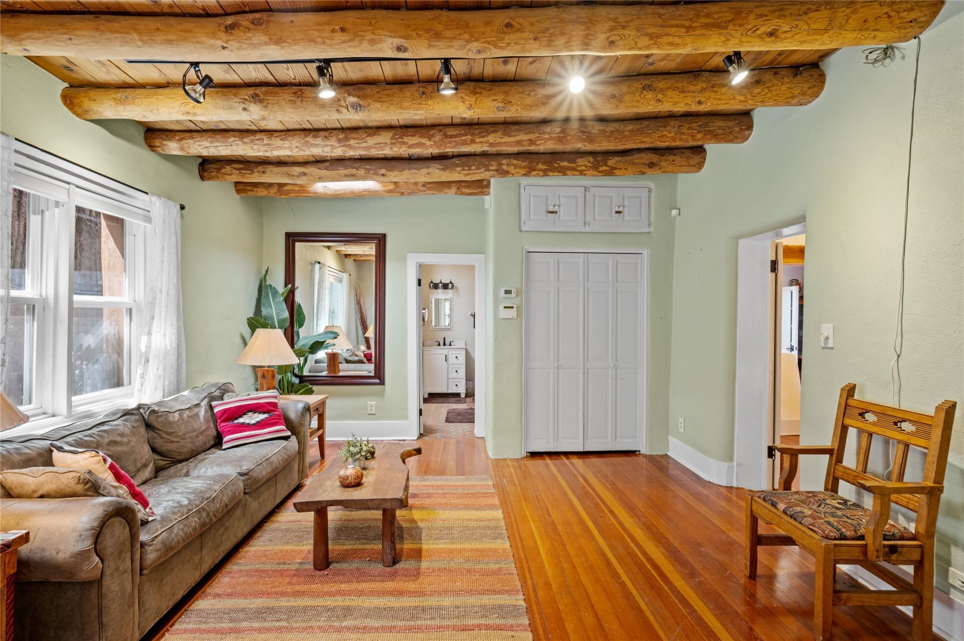 Thoughtfully updated with many recent improvements, this charming home beautifully blends Southwest character with modern comfort. Gated parking provides security and convenience, while the home itself is tucked away on a private lane, offering tranquil surroundings in a prime location. Just a few-minute walk to Canyon Road and only 12 minutes on foot to the Plaza, with its coffee shops, restaurants, and galleries. Enter through a shaded front courtyard, perfect for entertaining or enjoying peaceful evenings, setting the tone for the Santa Fe style carried throughout the home. Inside, vaulted viga ceilings enhance the living room, which features a cozy wood-burning fireplace and skylights for natural light. Saltillo tile flooring adds to the traditional ambiance. The updated kitchen boasts stainless steel appliances, ample storage, and generous workspace. This 1654 square foot home, built in 1967 offers two bedrooms and two bathrooms. The spacious primary suite features decorative tilework and radiant heat in both the bedroom and ensuite bathroom for year-round comfort. Mini-split systems provide additional efficient heating and cooling. The second bedroom is light-filled and opens to the front patio?perfect for guests or a home office. This unique home is a rare find, combining timeless adobe charm with thoughtful updates in a peaceful, private setting. Schedule your private tour today.